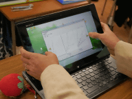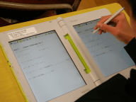 教材や問題などを片方のページに表示。もう1つのページに生徒が回答などを書き込むといった具合だ。さらに、生徒が課題に取り組んでいるときには、生徒が書いた内容を前面のプロジェクタに表示。ほかの生徒にヒントを与えるといった使い方も行なっている。