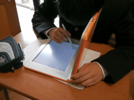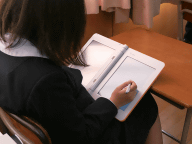 ペンは電磁誘導方式を採用。教材のノートへのコピー機能によって、ペン操作で、ノートの整理を行なえるようにしている。また、画面の表示を上下に切り替える機能を活用して、右利きの生徒には右側の画面をノート用とし、左利きの生徒は左側をノート用に設定でき、生徒が書き込みやすい環境を実現している。なお、横方向への表示切り替えには対応していない。