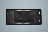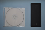 | バッテリには薄型のリチウムポリマー電池を採用。試用機のため、仕様を示すシールは貼られていなかったが、3.7V/4,250mAhとのことだ | バッテリを側面から見たところ。非常に薄い | CDケース(左)とバッテリのサイズ比較 |