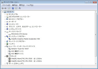 | Viliv N5のデバイスマネージャーを開いたところ。HT対応のAtom Z520を搭載しているので、2個のプロセッサとして認識されている |