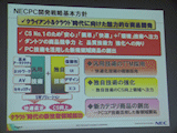 さらに小野寺本部長は、製品開発の基本方針を「クライアント&クラウド時代に向けた魅力的な商品開発」とし、「CS No.1に向けては、安心、簡単、快適といったこれまでの取り組みに加えて、環境技術を新たな軸として捉え、さらに、ダントツの商品競争力と品質技術力強化へこだわること、PC技術を活用した新規領域商品の創出に取り組む考えである。IntelやAMDが提供する基本アーテキチクャーやAV、ネットワーク、セキュリティといった汎用技術を、タイム・トゥ・マーケットをベースにした最適なタイミングで採用するとともに、当社が取り組む材料構造技術をはじめとする5つの独自技術を活用することで、PCコア技術を活用した新カテゴリ商品の創出にも積極的に取り組んでいく」とする。