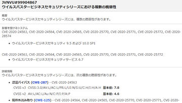ウイルスバスター法人向け製品に深刻度最高のものを含む複数の脆弱性