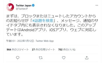 Twitter、ブロック/ミュートしたアカウントからのお知らせが非表示に
