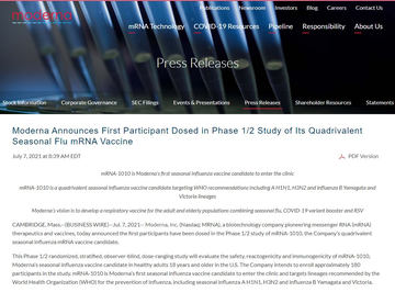 モデルナ、季節性インフルエンザのmRNAワクチンを臨床試験開始