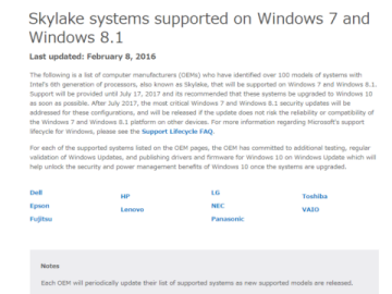 公式サポート対象となるWindows 7/8.1搭載Skylake機のリストが公開