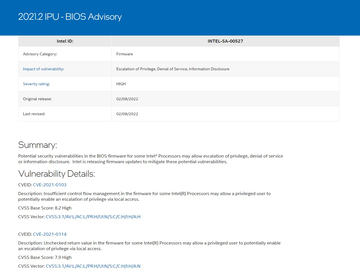 Intel CPUのBIOSリファレンスコードに特権昇格の脆弱性