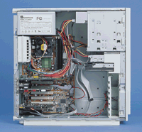 Blaster Live! Value」、光学ドライブは東芝のDVD-ROM・CD-R/RW複合ドライブ「SD-R 1002」を搭載する。ちなみにマザーボードは、もはやi815E搭載マザーボードとしては定番となった感のある、ASUSTeKの「CUSL2」が採用されている。また、ケースは、デルコンピュータのPCにも採用され、メンテナンス性や拡張性は申し分ないものが使われている。サイドパネルはドライバーを利用せずに開けることができ、5インチベイや3.5インチベイも簡単に取り外せるだけでなく、各ベイの数も十分(5インチ×2、3.5インチ×5)だ。COM2のシリアルポートが用意されるなど、細かい部分での配慮もされている。(平澤寿康) |