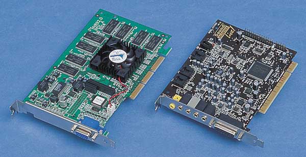 DDR SDRAMを搭載するELSAの「GLADIAC 64 AGP」(ビデオチップはGeForce2 GTS)、サウンドカードはクリエイティブメディアの「Sound