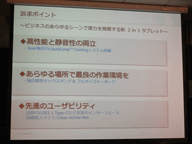 発表会には、日本マイクロソフト株式会社 執行役員 コンシューマー&パートナー グループ OEM統括本部長 金古毅氏、およびダイワボウ情報システム株式会社 販売推進本部 取締役 販売推進本部長の松本裕之氏も呼ばれ、新製品投入への祝辞を贈るとともに、さらなる市場拡大が期待されるWindows 10 Anniversary Updateの特徴、そしてダイワボウがかねてより日本マイクロソフトと協業してWindowsモバイルビジネスセンターを設立したことにより、法人でのWindowsが順調にシェアを拡大している点が解説された。