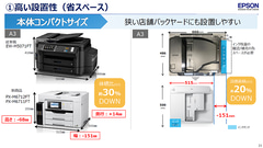 PX-M6712FTおよびPX-M6711FTは、A3ノビに対応した機種。筐体デザインは共通で、前者が上位モデルにあたる。以前から建設や土木などの分野で多く利用されていたが、小型化や使い勝手の部分を強化することで、飲食や小売業、塾などの学習/教育分野での導入も見込む。