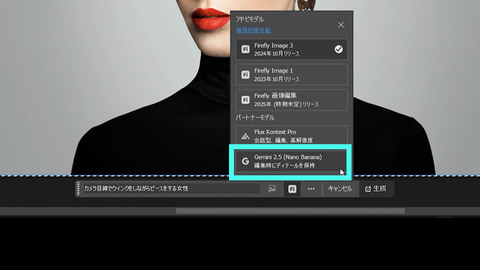 Photoshopのベータ版に生成AIのパートナーモデルとしてGoogleが開発したGemini 2.5 Flash Image(通称Nano Banana)が追加されました。これによりPhotoshopから移動することなく、さらに幅広い画像生成が可能となりました。たとえば、モデルの人物はそのままで、別のポーズや表情を生成しようとしても、Adobe Fireflyでは元のモデルとは別の人物が生成されていました。しかし、Gemini 2.5 Flash Imageでは、モデルのディテールを保ったままポーズや表情を変えることができます。