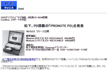 松下が650MBの光ディスクドライブ「PD」を搭載した世界初ノートを発表