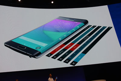 また、同時に発表された「Galaxy Note Edge」は、Note 4の特徴はそのままに、さらに外観に大きな工夫がもたらされた。長辺部分のエッジに細長い曲面液晶を実装し、カバーなどを閉じていても、また、メインの画面がオフになっていても各種の情報やコマンダー表示ができるようにしたのだ。まるでスマートフォンの画面の延長としてのAndroid Wear的な要素を本体に実装してしまったようなイメージだ。