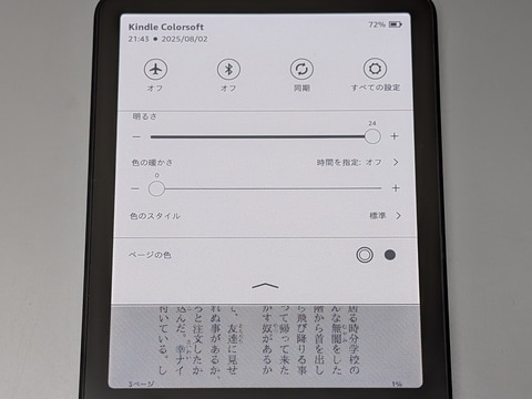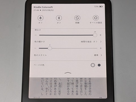 ちなみに汎用のE Ink端末である「BOOX」のように、表示設定を細かくチューニングする機能は、前述の「色調」を除けば存在しないが、それはKindleアプリに合わせてチューニング済みであるためで、ないからと言って困ることはない。楽天Koboのカラーモデルにも言えるが、あれこれ調整せずにそのまま使えるという意味で、本製品のほうが扱いやすい。