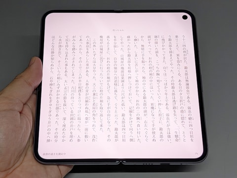 画面は中央に折れ目こそあるものの、左右がつながっていることから、見開きのページが真ん中で分割されることがなく、テキストの行が折り目の部分にかかってもきちんと読める。また1行あたりの文字数が多すぎることもなく、適度な長さに感じられる。文庫本を読んでいる感覚に近く、テキストコンテンツとの相性は良好といっていいだろう。