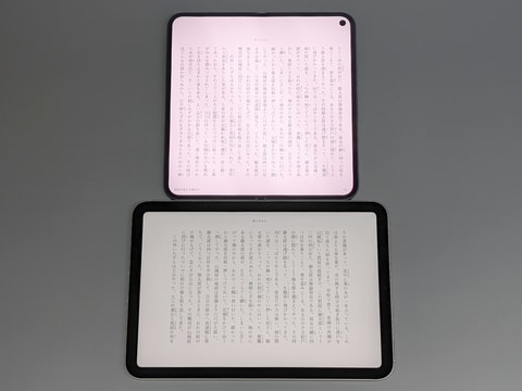 この「見開き表示では90度回転」をどう評価するかはユーザー次第だが、本製品を購入したついでにたまたま電子書籍アプリを試すといったライトな使い方ではなく、電子書籍を主目的にフォルダブルである本製品を選んだという熱の入ったユーザーにとっては、見開き表示は必須条件と考えられるので、90度回転させるという原始的な方法でしか対処できないのは、正直期待外れといえる。