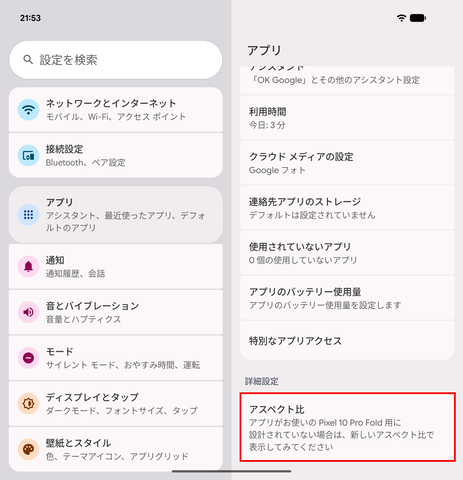 さて筆者は同じPixel 10シリーズのフラグシップモデルである6.9型の「Pixel 10 Pro XL」を日常で使用しているが、本製品はそれと比べて画面の広さこそインパクトがあるものの、天地サイズはむしろ窮屈に感じる。昨今の大画面スマホを使っている人は、皆近い感想を抱くのではないだろうか。