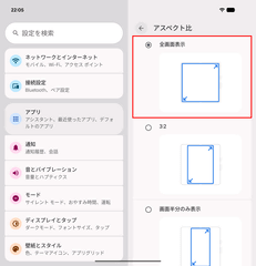 この「アスペクト比」という項目、本製品では試験運用版の但し書きが取れて正式版へと進化しているのだが、困ったことにKindleアプリについては以前と挙動が異なっており、「アプリのデフォルト」「全画面表示」「3:2」「画面半分のみ表示」という4つの選択肢のいずれを選んでも見開き表示にならない。以前は「全画面表示」を選ぶと見開き表示になっていたのが、選択肢自体が失われてしまった格好だ。