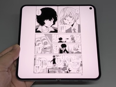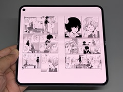 コミックについてはどうだろうか。こうしたフォルダブルスマホに期待されるのは、やはり見開き表示だろう。本製品は開いた状態では横長ではなく微妙に縦長なのだが、従来モデルでは設定画面の中に「アスペクト比(試験運用版)」なる項目があり、アプリ側の最適化が不完全であっても、強制的に向きを固定し、見開きで表示することが可能だった。