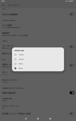 なお本製品は144Hzのリフレッシュレートに対応することを大きくアピールしているが、可変リフレッシュレートではなく、標準では60Hzに固定されている。スクロールタイプの電子書籍を読む機会が多い場合や、電子書籍以外にブラウザでウェブページを参照する機会が多いようであれば、設定画面の「ディスプレイ」の項で変更しておいた方がよい。