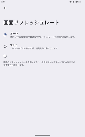 本製品の売りである高リフレッシュレート(90Hz)がバッテリ消費を早めている可能性を考慮し、設定画面をチェックしてみたが、選択肢は「自動」「90Hz」の2つのみ。開発者モードで見る限り、「自動」の場合もほぼ常時90Hzで動作しており、これを60Hzに抑えようにも、現状ではその方法がない。このあたりが少々ちぐはぐさを感じる。