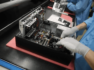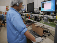 コンピュータにより、ランダムに選ばれた完成品を拭き取って開梱。梱包状態や、製品の外観、テストプログラムを使用した再検査、付属品の状況を全て確認する。