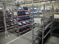 部品がセットされたトレイは、実際の組み立てに入り、ここで、マサーボードを装着し、CPUやメモリ、HDDや光学ドライブなどが組み込まれる。これらの部品は、同じフロアにある部品倉庫から可動式ラックで供給される。