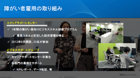 さらに、2012年6月から設置しているキャリアサポートセンターでは、障がい者雇用にも取り組んでいる。1年間の障がい者向けビジネススキル研修プログラムを通じて、業務スキルと安定した就労習慣を身につけ、プログラム修了後には、社内で雇用するなど、卒業生に対する就労支援を行なっている。これまでに33人が参加している。