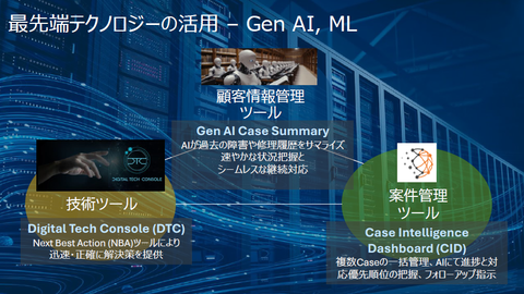 グローバルのサポート拠点において、共通的に利用しているものを、日本でも2022年以降、順次、導入を進めており、生成AIやマシンラーニングを積極的に活用している。