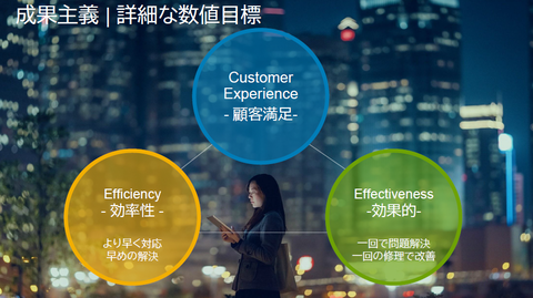 さらに、効率性では、より早く対応し、より早く解決することを追求。効果では、1回の問い合わせで問題を解決し、1回の修理で改善することを目指している。