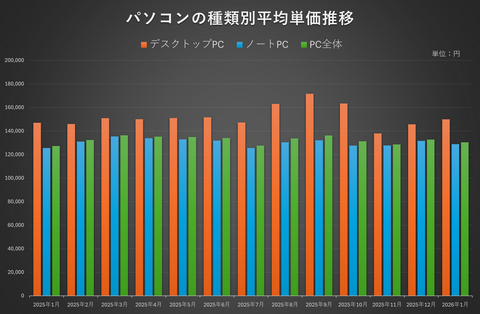 2026年1月の集計では、PC全体の平均単価は13万300円となり、1年前となる2025年1月の12万7,200円に比べると、3,100円の上昇となっている。上昇幅は約2.4%であり、それほど大きな上昇幅にはなっていない。むしろ、年末の2025年12月の集計では13万2,700円となっており、逆に1月に入って、平均単価が減少しているという結果すら出ている。