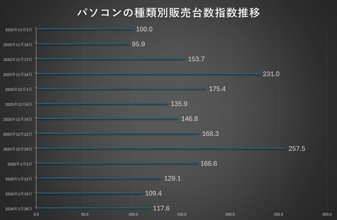 しかも、その後も大きな落ち込みがなく、高い水準で推移。12月最終週(12月29日~2026年1月4日)は257.5と、ブラックフライデーを上回る販売指数を記録した。値上げが実施されるといわれた2026年1月に入る前に、PCを購入したいという購入者が集中したといえる。