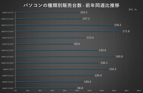 また、1月に入っても、PCの販売台数は増加傾向を維持しており、2026年1月第1週(1月5日~11日)は前年同週比50.2%増、第2週(1月12日~18日)が26.4%増と高い水準を維持している。
