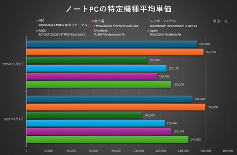 NEC PCで最も売れているLAVIE N16の場合、12月が15万2,500円だったものが、1月には14万8,000円と約3%下落。レノボ・ジャパンのIdeapad Slim 3i Gen 10は、12月の10万7,900円から、1月は10万3,500円へと4%の価格下落。ASUSのROG Xbox Ally Xは12月の12万5,100円から、1月は12万3,700円へと1%のダウンとなった。