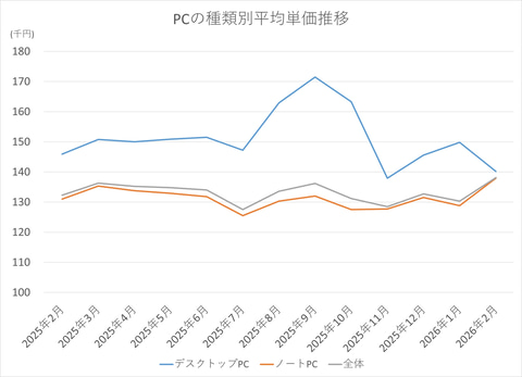 ノートPCは、2026年2月の平均単価は13万7,900円となり、2026年1月の12万8,800円から、9,100円上昇した。これに対してデスクトップPCは、2026年2月の平均単価が14万200円となり、2026年1月から9,600円下落している。ノートPCは平均単価が上昇、デスクトップPCは平均単価が下落するという逆の結果になっている。