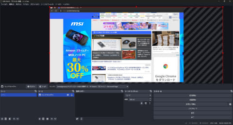 前回の記事で解説した「ファイル」→「設定」→「映像」の「基本解像度」とゲームの解像度が違う場合、ゲームキャプチャの枠がキャンバスからずれるだろう。そういった場合は、プレビューウィンドウ上でゲーム画面をドラッグしたり、赤い枠をドラッグしてキャプチャウィンドウの位置やサイズを調整しよう。