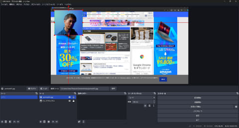 こちらも、ウィンドウや赤枠をドラッグして、キャンバス内での位置やサイズを調整しよう。ゲーム画面と違って、カメラ映像については、元が縦横比16:9だけど、1:1にしたいといったこともあるだろう。そういう時は、Altキーを押しながら赤枠を内側にドラッグするとトリミングできる。トリミングした辺は緑色の点線で示される。