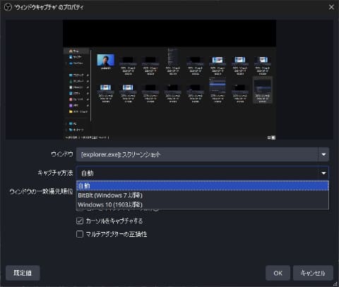 ゲームによってはブラウザでプレイするものもある。この場合は、ゲームキャプチャではなく「ウィンドウキャプチャ」を指定し、「ウィンドウ」でキャプチャしたいウィンドウ(ブラウザ)を選ぶ。「キャプチャ方法」は自動になっている。これだとキャプチャできない場合もあるが、「Windows 10(1903以降)」にすれば行けるだろう。