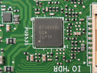 そこで本製品は、RichTek製のドライバ内蔵デュアルチャネルPWMコントローラ「RT3606BC」と、ドライバを省いたデュアルチャネルPWMコントローラ「RT3606BE」の2つを搭載し、大規模な電源回路を実現している。いずれもIMVP8に準拠しており、2つの電圧レールを持つことができる。この2つのチップの片方がCPUコア、もう片方がGPUコアに供給する電源を生成しているのは間違いないだろう。詳しくは分析していないのだがコイルやMOSFETの実装からするに、CPU側にもGPU側にもそれぞれ3フェーズの電源を用意していると見ていい。