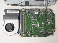 ベアボーンとして使う場合、底面を開けるだけで組み立てが完結するのだが、本記事では仕組みを見るため完全に分解した。筐体はプラスチックの“ガワ”とスチール製のフレームの2層構造となっているのだが、このガワの爪が基板を取り出す際の邪魔になるので、まず天板を外して、そこから見えるネジと、一部EMI対策と思われるシールの端を外し、プラスチックのガワをフレームから分離させておく。それから基板を取り出すには、CPUクーラーと基板四隅のネジを外して、ちょっとフレームを広げてやって、USBポートなど引っかかる部分から取り外すと良い。