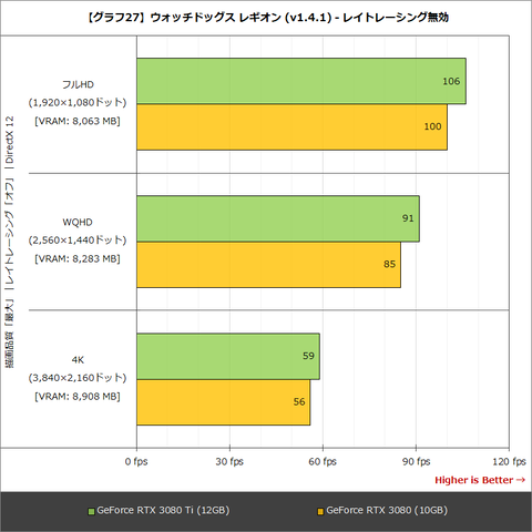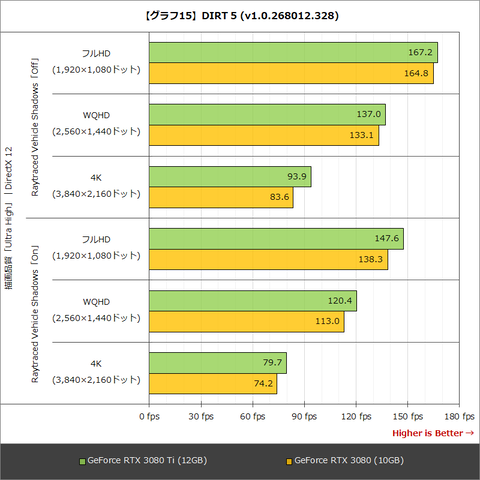CPUがボトルネックになりやすいこのゲームでは、4Kで約1%だけGeForce RTX 3080 Tiがリードしてはいるものの、今回の環境では両GPUの間に大きな差はつかなかった。