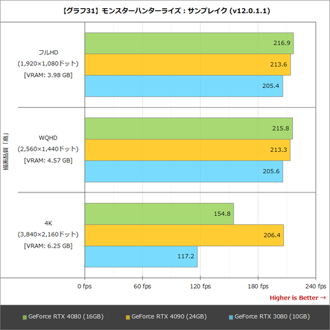 モンスターハンターライズ:サンブレイクでは、画質プリセットを「高」に設定して、フルHD~4Kまでの画面解像度で平均フレームレートを計測した。