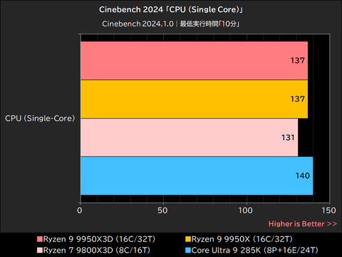 シングルスレッド性能を計測するCPU (Single Core)では、Ryzen 9 9950X3DがRyzen 9 9950Xと並ぶ「137」を記録。Core Ultra 9 285Kを約2%下回る一方で、Ryzen 7 9800X3Dを約5%上回った。