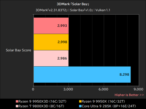 3DMarkの軽量レイトレーシングテスト「Solar Bay」において、Ryzen 9 9950X3Dは僅差ながら比較製品中最下位のスコアとなっており、Ryzen 9 9950Xを約1%、Ryzen 7 9800X3Dを約0.1%、Core Ultra 9 285Kを約2%下回った。