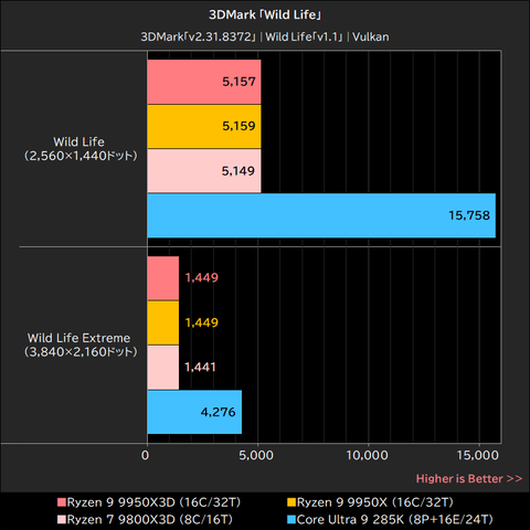 通常版のWild Lifeにおいて、Ryzen 9 9950X3Dは僅差ながら全体2番手のスコアを記録しており、Core Ultra 9 285Kを約6%下回る一方で、Ryzen 9 9950Xを約1%、Ryzen 7 9800X3Dを約7%上回った。