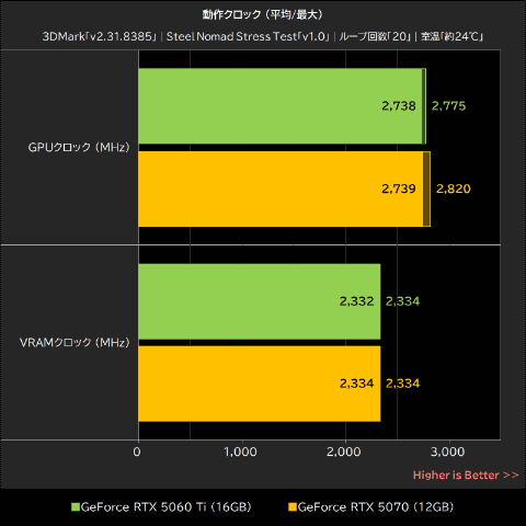 テスト中のGeForce RTX 5060 Tiは、電力リミットの上限に近い平均175.8W(最大180.5W)を消費しながら動作しており、この時のGPU温度は平均63.9℃(最大66.6℃)、VRAM温度は平均69.1℃(最大70.0℃)で、GPUクロックが平均2,738MHz(最大2,775MHz)、VRAMクロックは平均2,332MHz(最大2,334MHz)だった。