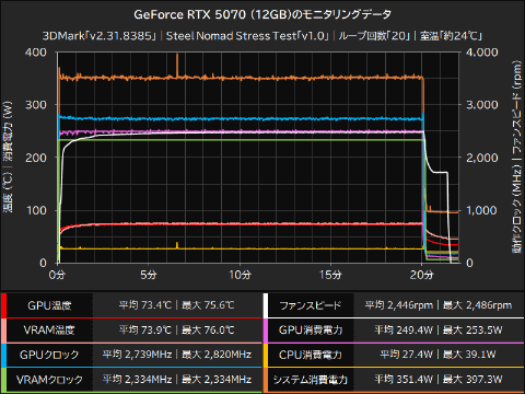 モニタリングソフトのHWiNFO64 Proを使用して、3DMarkのSteel Nomad Stress Test実行中のモニタリングデータを取得した結果が以下のグラフ。