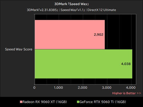 Radeon RX 9060 XTが記録したスコアは「2,902」で、GeForce RTX 5060 Tiの「4,038」を約28%下回った。