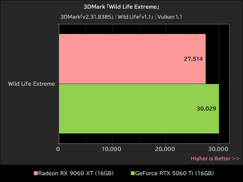 高負荷版のWild Life ExtremeにてRadeon RX 9060 XTが記録したスコアは「27,514」で、GeForce RTX 5060 Tiの「30,029」を約8%下回った。