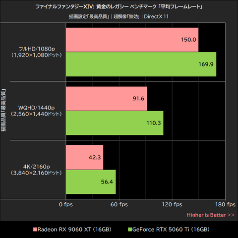 Radeon RX 9060 XTとGeForce RTX 5060 TiがWQHD/1440p以下の解像度で上限フレームレートに達しており、GPUボトルネックによるフレームレートの低下が生じた4K/2160pでは、平均39.1fpsを記録したRadeon RX 9060 XTが、平均55.6fpsのGeForce RTX 5060 Tiを約30%下回った。